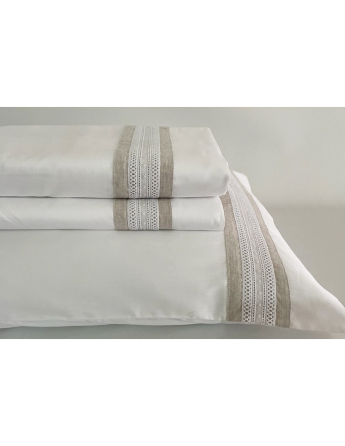 Sábana encimera y almohadas con aplicación de tejido y bordado. Las almohadas tienen aplicación por ambos lados y se cierran con una solapa.