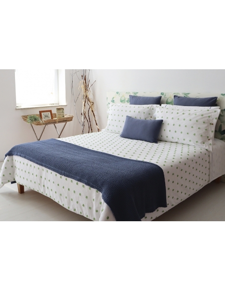 La funda se cierra con una solapa de 0,45 cm en la parte inferior para colocar debajo del colchón o hacer un sobre, evitando que se resbale. Y los cojines se cierran con botones a ambos lados.