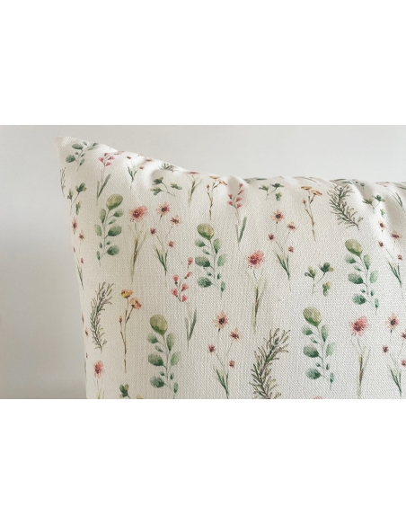Funda de cojín de algodón con estampado digital en la parte delantera y trasera lisa, igual que el color de fondo. Tiene cremallera invisible en un lateral.