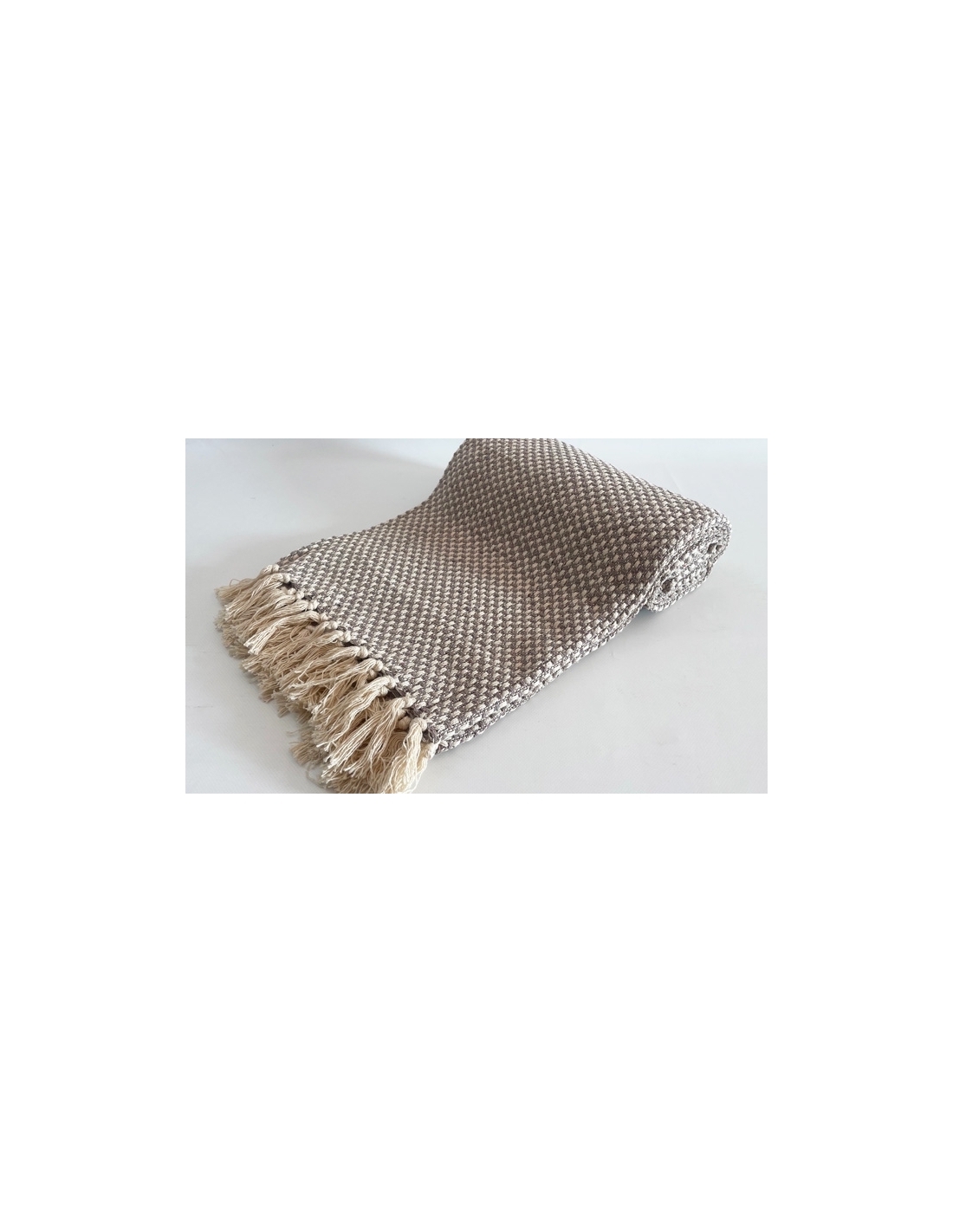 Manta con tejido entretejido en dos tonos de beige y acabado en flecos.