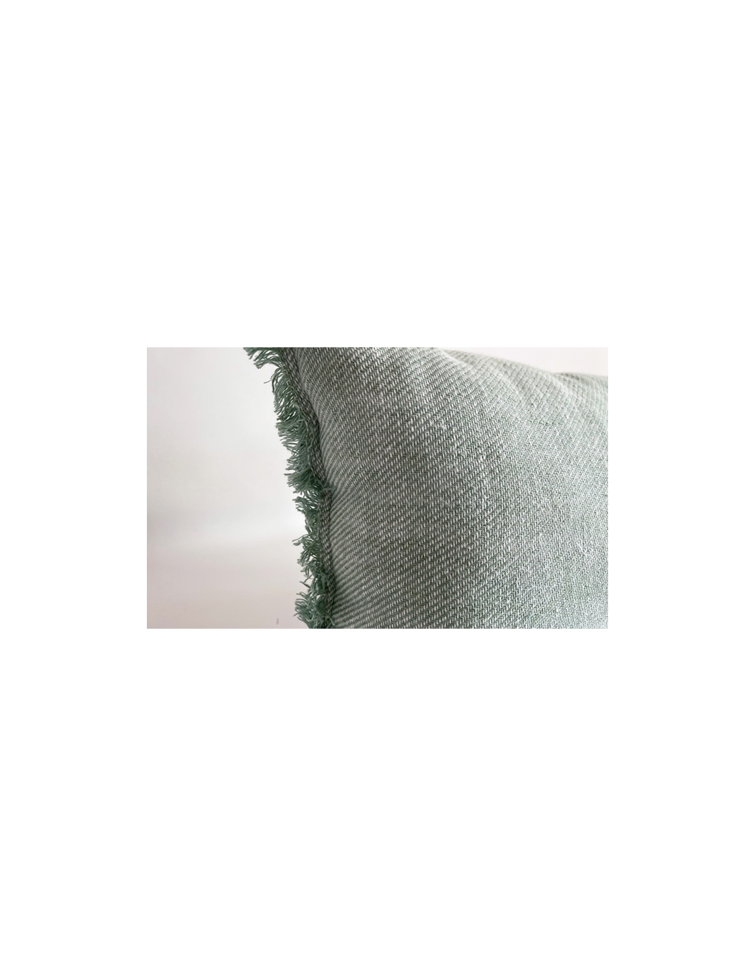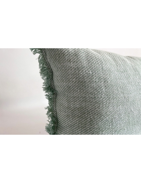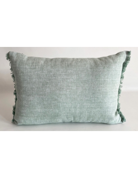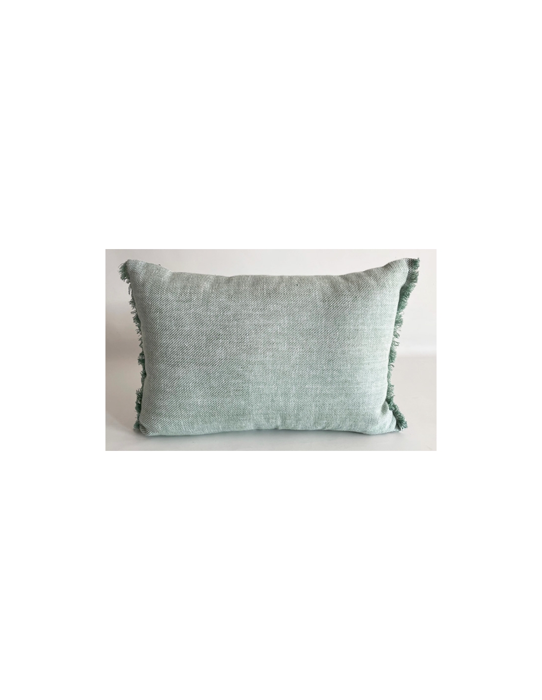 Funda de cojín con flecos en los extremos. Es reversible y tiene cremallera en un lateral.