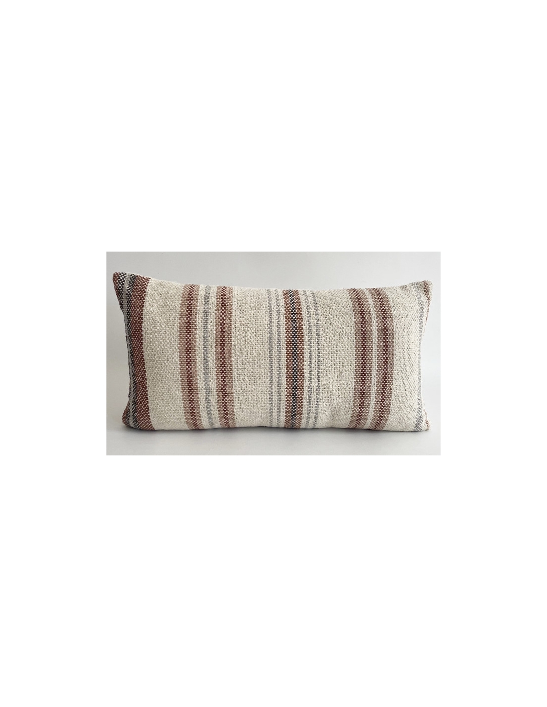Funda de cojín de algodón grueso con rayas tejidas en tonos tierra. Parte trasera de lona lisa con cremallera oculta de longitud media y solapa. Cada cojín puede presentar ligeras variaciones de color debido al proceso de teñido y la configuración de la pantalla.
