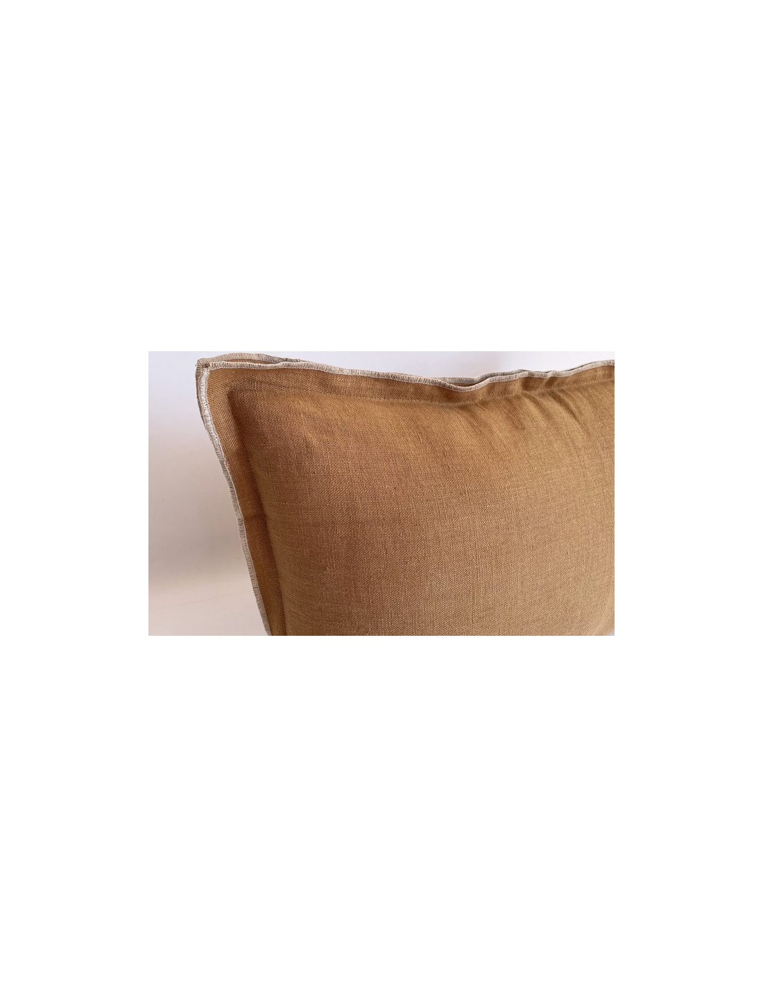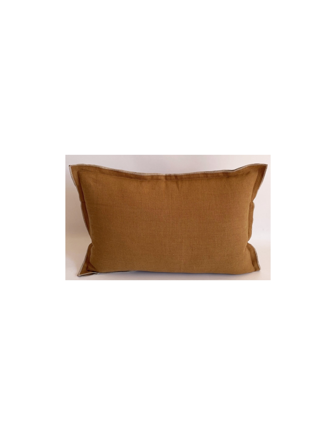Funda de cojín lisa de lino con pespuntes interiores que definen la forma, rematada con una doble solapa y ribete al bies en contraste.