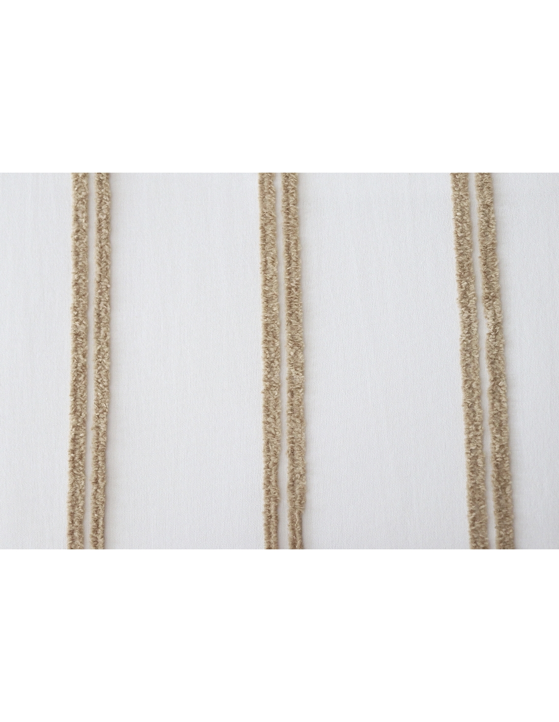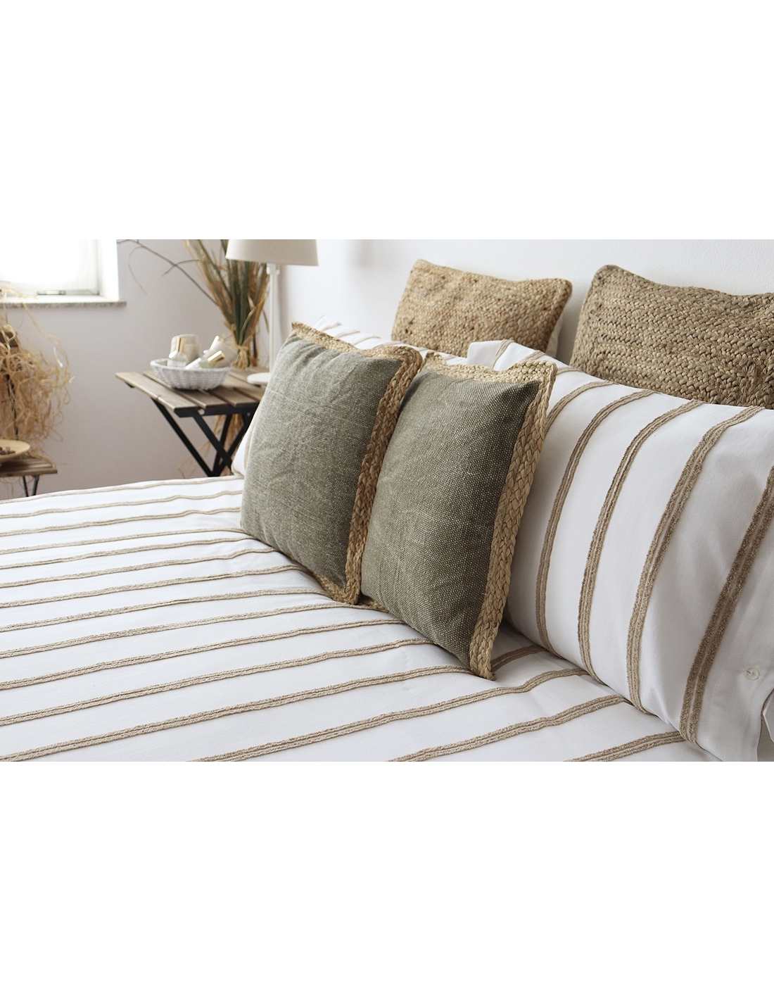 La funda se cierra con una solapa de 0,45 cm en la parte inferior para colocar debajo del colchón o hacer un sobre, evitando que se resbale. Los cojines se cierran con botones a ambos lados.