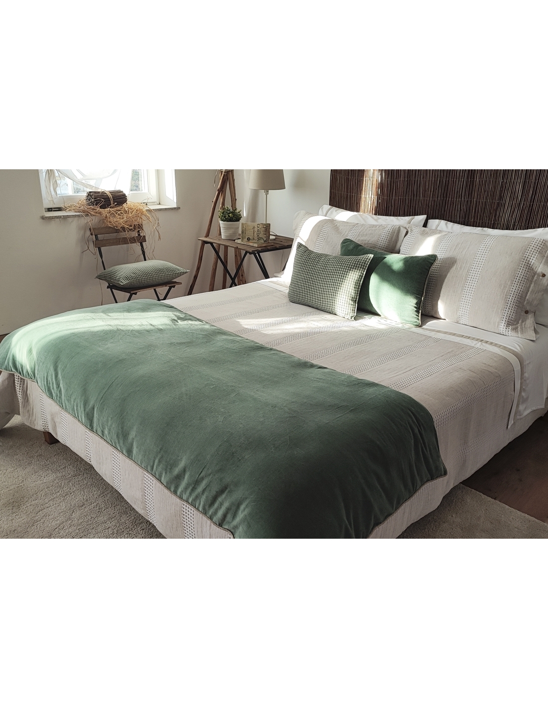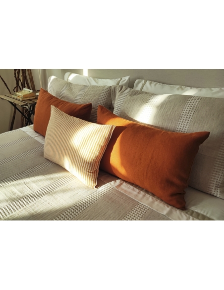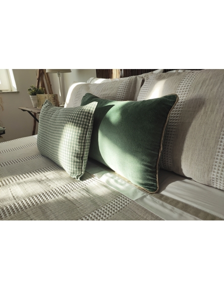 La funda se cierra con una solapa de 0,45 cm en la parte inferior para colocar debajo del colchón o hacer un sobre, evitando que se resbale. Los cojines se cierran con botones a ambos lados.