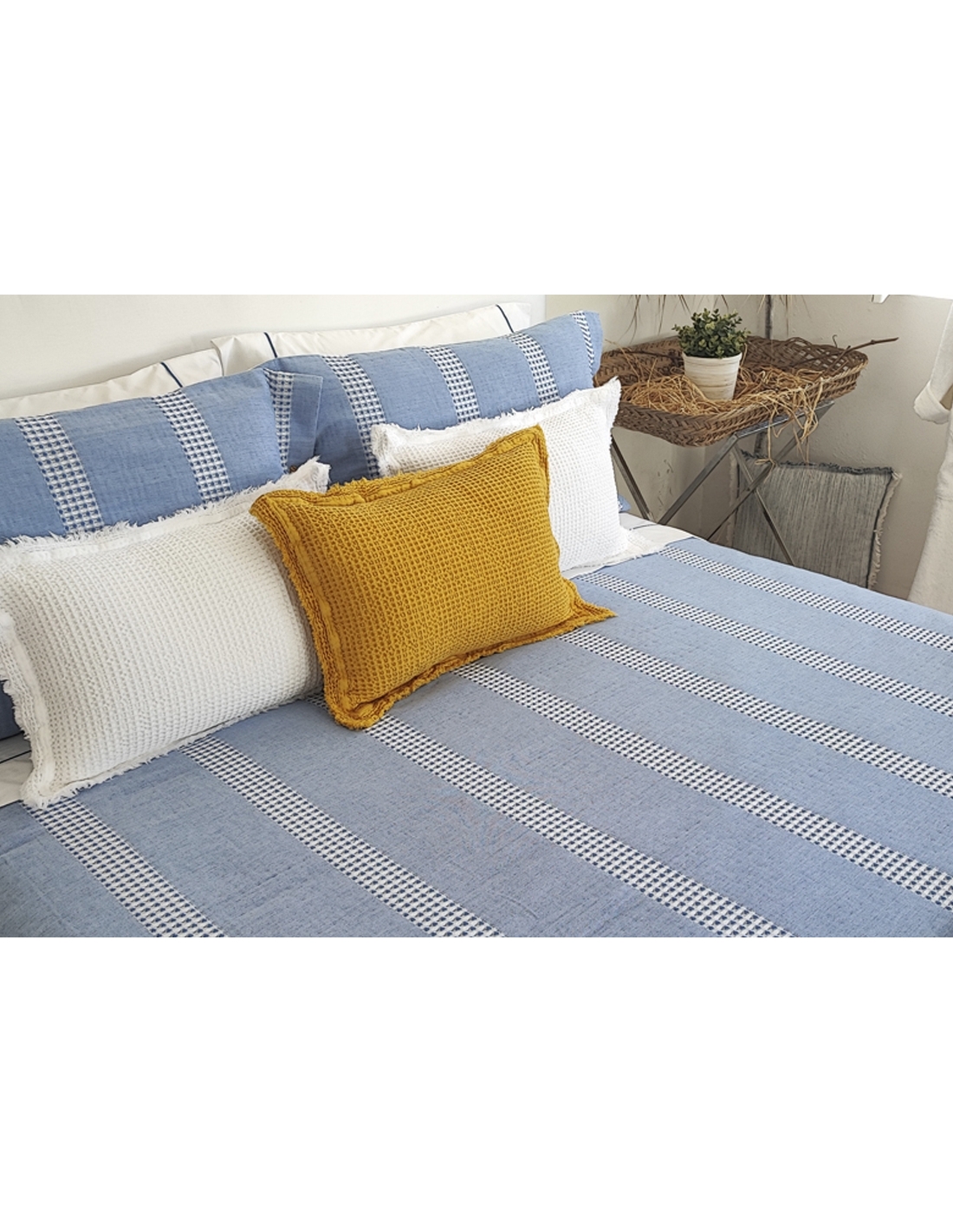 La funda se cierra con una solapa de 0,45 cm en la parte inferior para colocar debajo del colchón o hacer un sobre, evitando que se resbale. Los cojines se cierran con botones a ambos lados.