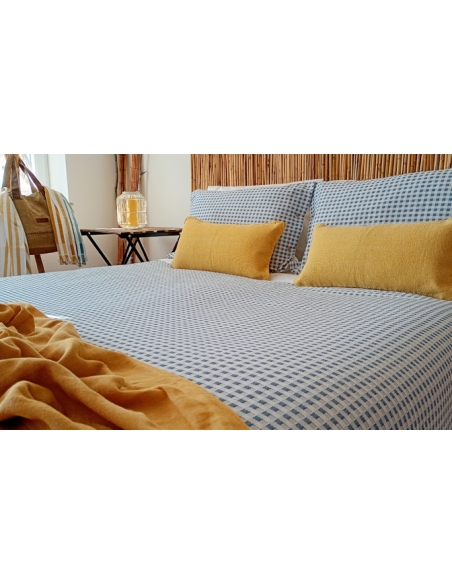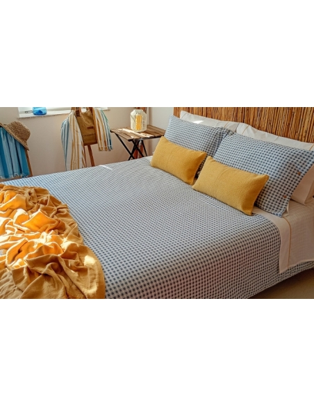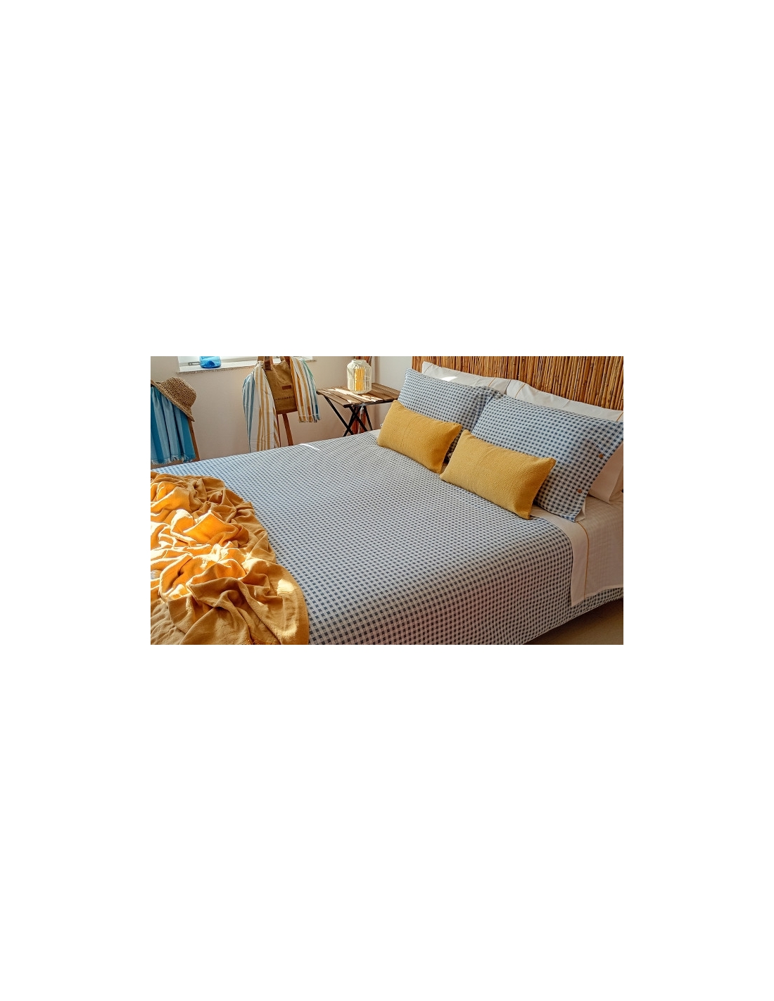 La funda se cierra con una solapa de 0,45 cm en la parte inferior para colocar debajo del colchón o hacer un sobre, evitando que se resbale. Los cojines se cierran con botones a ambos lados.