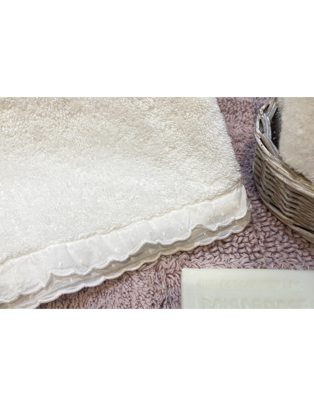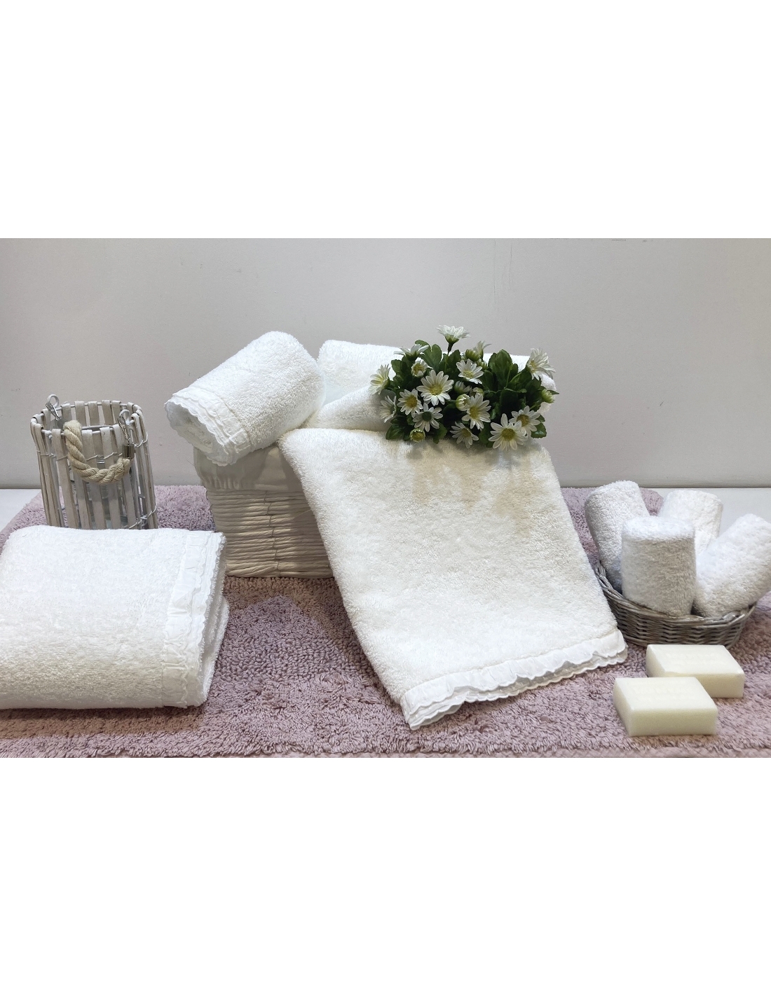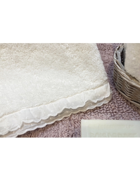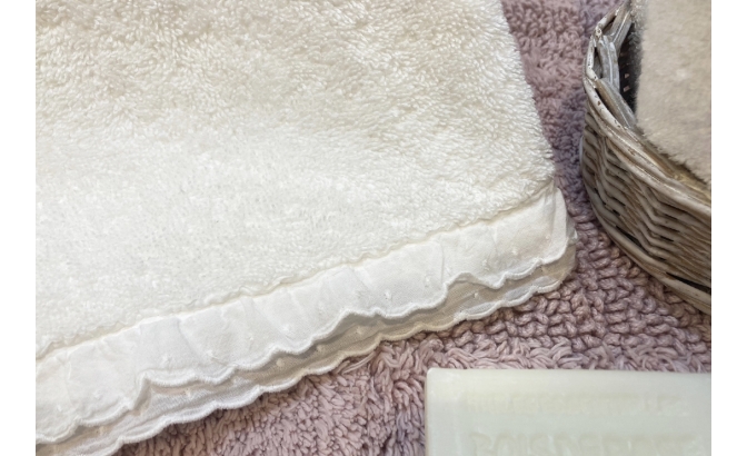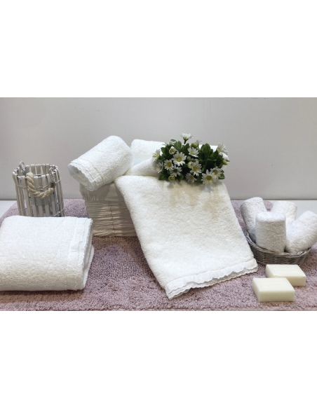 Juego de toallas en rizo blanco con bordado inglés en la punta y acabado stonewash.