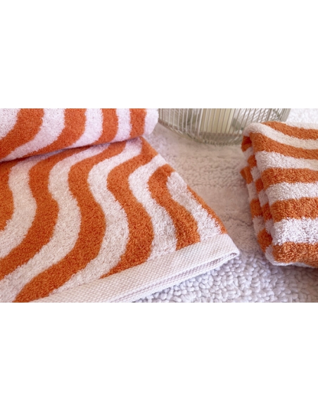Juego de toallas de algodón suaves y absorbentes con un estampado de ondas fluidas que aporta un toque fresco y contemporáneo al baño.