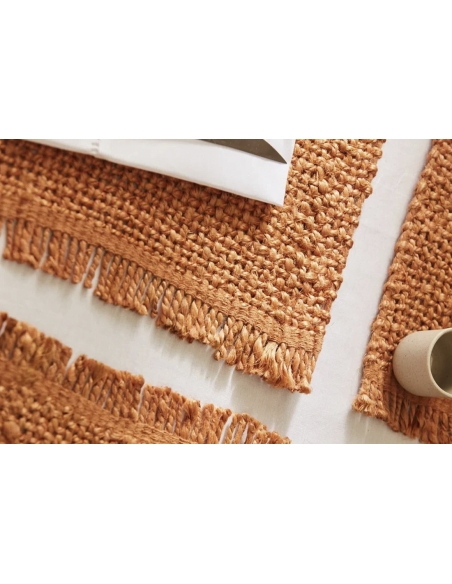Mantel individual de yute trenzado con acabado de flecos. Una opción sencilla pero sofisticada que aporta un toque de elegancia a cualquier mesa.