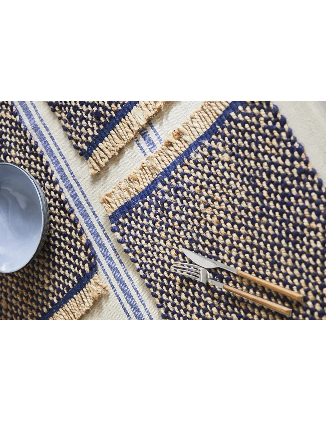Mantel individual de yute trenzado con acabado de flecos. Una opción sencilla pero sofisticada que aporta un toque de elegancia a cualquier mesa.