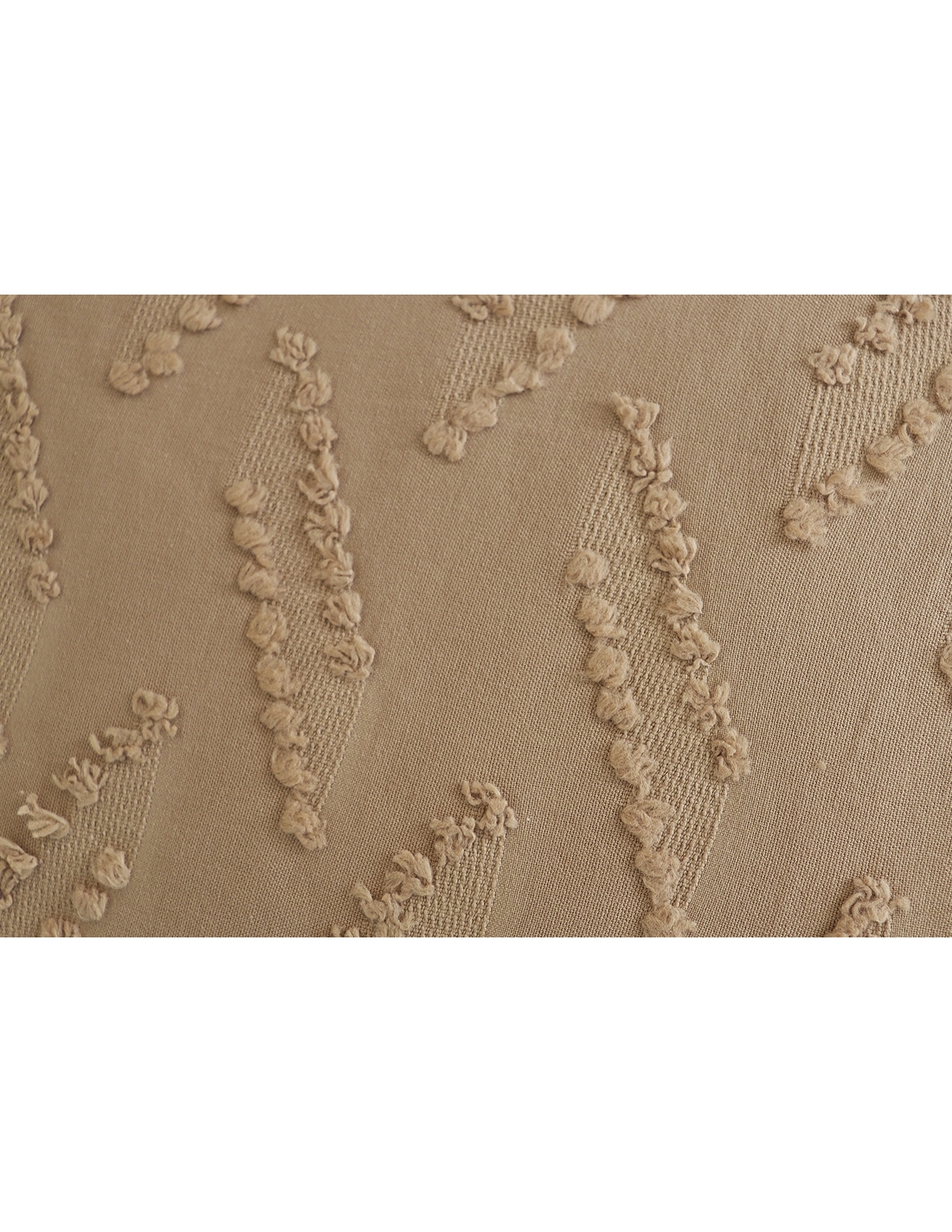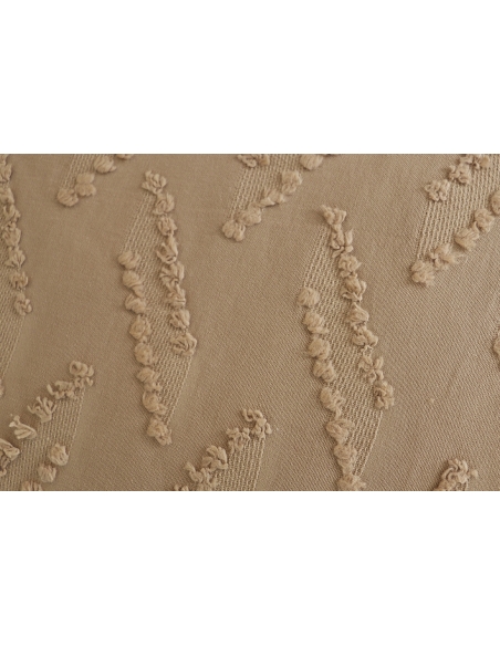 La funda se cierra con una solapa de 0,45 cm en la parte inferior para colocar debajo del colchón o hacer un sobre, evitando que se resbale. Los cojines se cierran con botones a ambos lados.