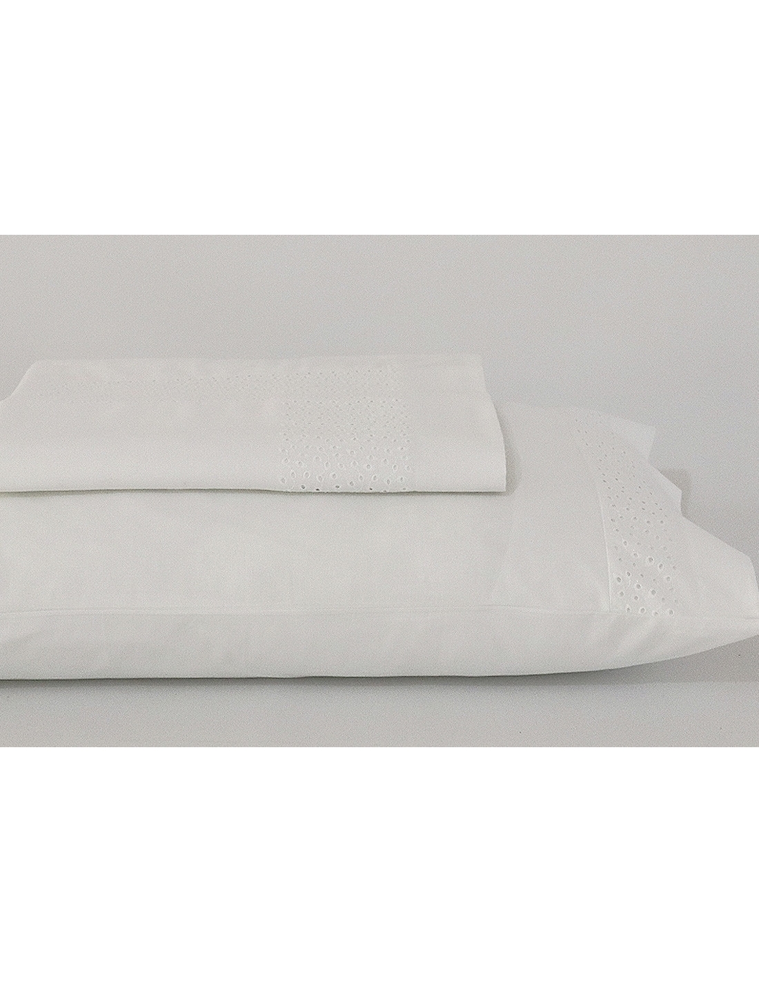 Sábana encimera y almohadas bordadas. La sábana con acabado de esquina y las almohadas están bordados a ambos lados y se cierran con una solapa.