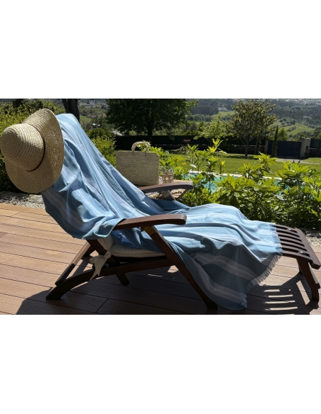 Toalla de playa tipo pareo con interior de rizo. El interior de rizo le confiere una buena capacidad de absorción de agua y su tejido fino de algodón la hace suave al tacto, cómoda y de secado rápido. Es reversible y se puede utilizar por ambos lados.