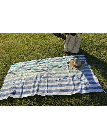 Toalla de playa tipo pareo con interior de rizo. El interior de rizo le confiere una buena capacidad de absorción de agua y su tejido fino de algodón la hace suave al tacto, cómoda y de secado rápido. Es reversible y se puede utilizar por ambos lados.