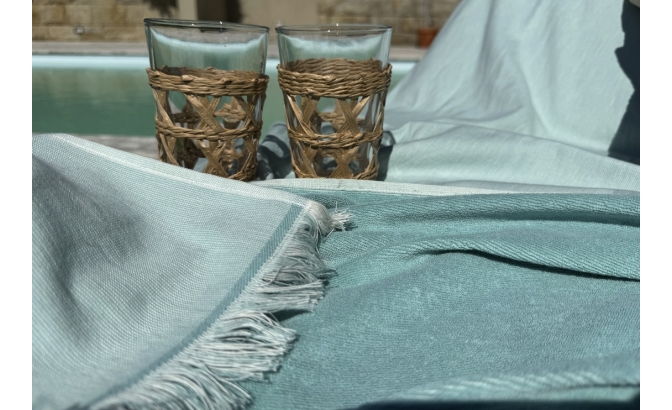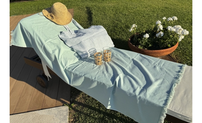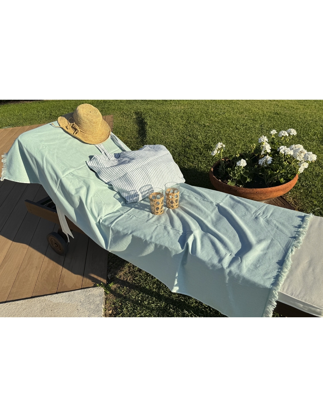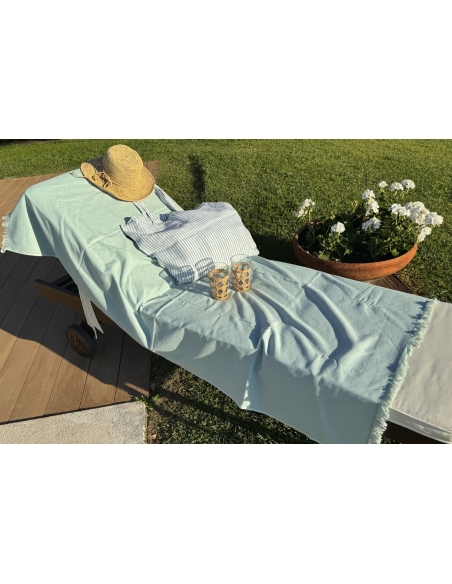 Toalla de playa tipo pareo con interior de rizo. El interior de rizo le confiere una buena capacidad de absorción de agua y su tejido fino de algodón la hace suave al tacto, cómoda y de secado rápido. Es reversible y se puede utilizar por ambos lados.