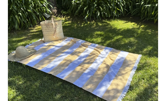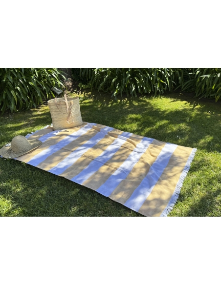 Toalla de playa tipo pareo con interior de rizo. El interior de rizo le confiere una buena capacidad de absorción de agua y su tejido fino de algodón la hace suave al tacto, cómoda y de secado rápido.