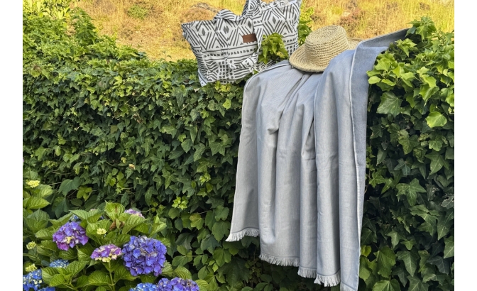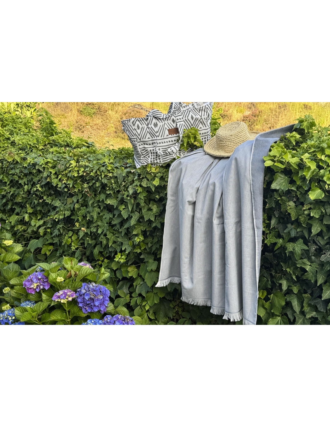 Toalla de playa tipo pareo con interior de rizo. El interior de rizo le confiere una buena capacidad de absorción de agua y su tejido fino de algodón la hace suave al tacto, cómoda y de secado rápido. Es reversible y se puede utilizar por ambos lados.