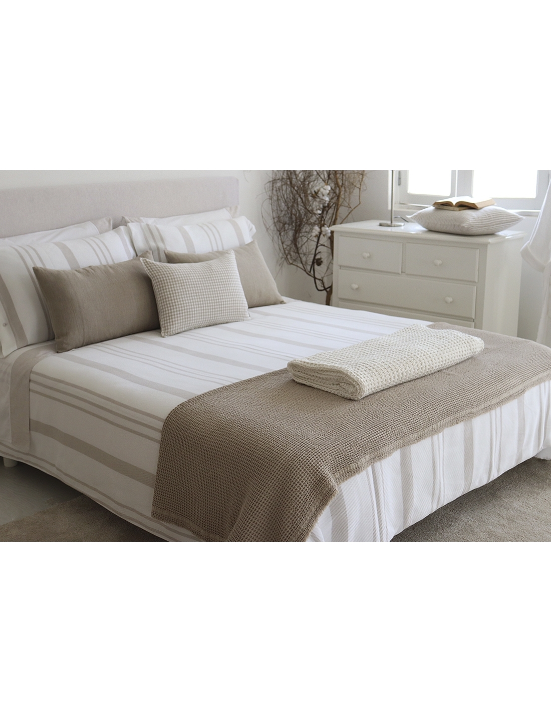 Housse de couette 100% coton avec motif et revers en percale 200 fils, ainsi que des oreillers de différentes tailles.