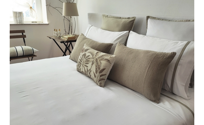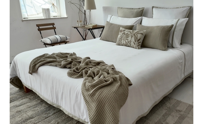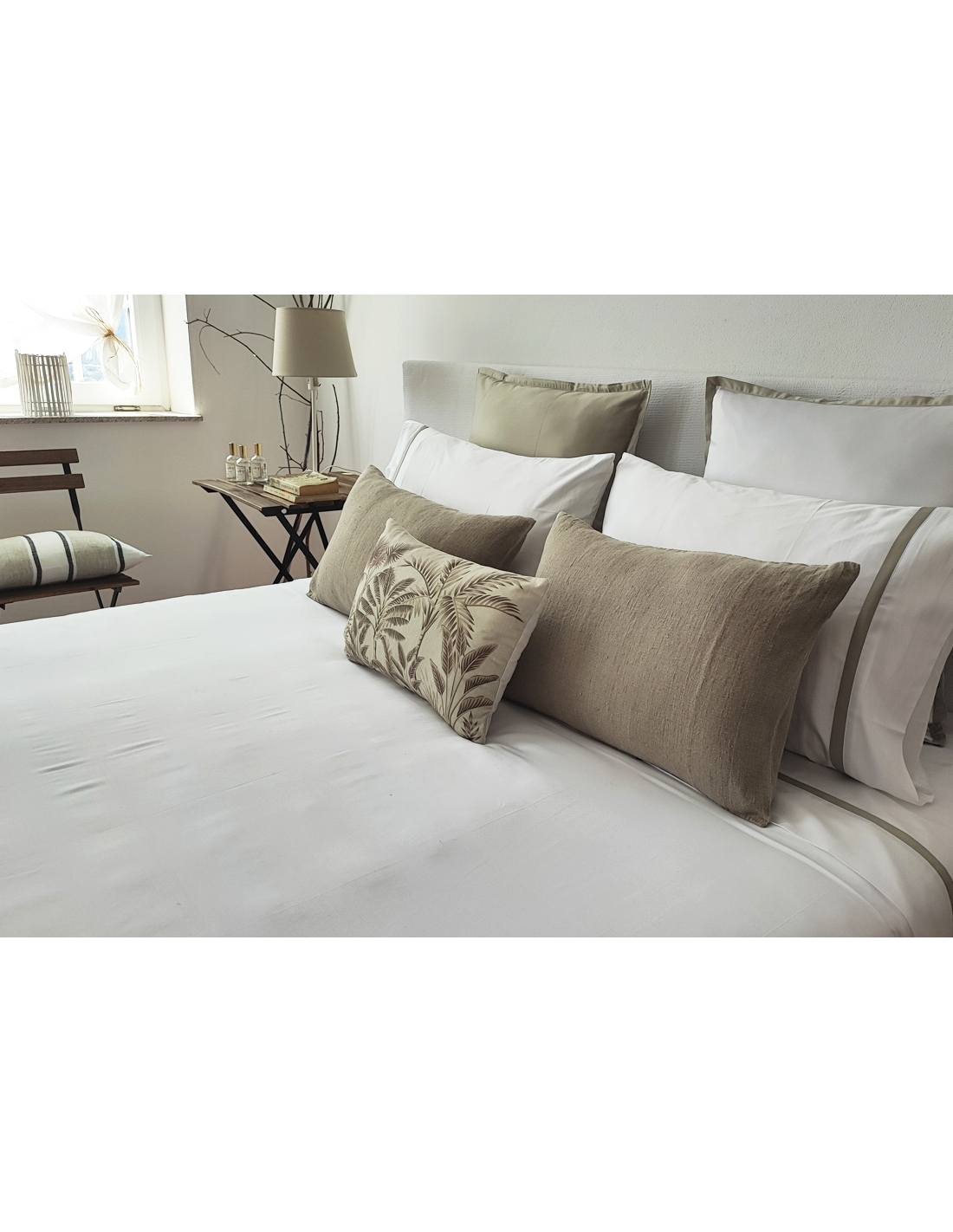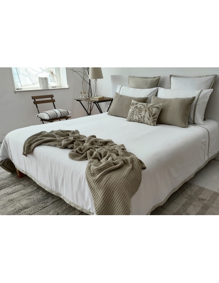 Housse de couette réversible, avec un rabat coloré de 3,5 cm sur les quatre côtés et uni à l'intérieur. Les coussins sont appliqués de couleur sur un côté et se ferment par un rabat.