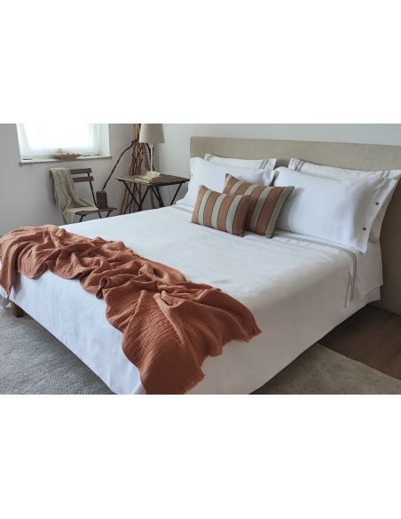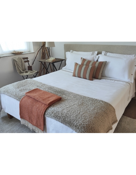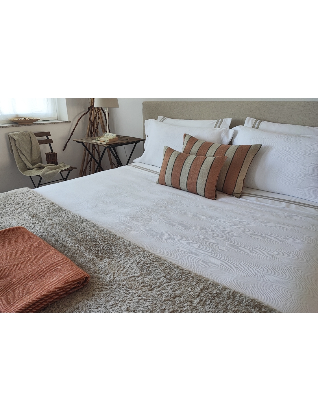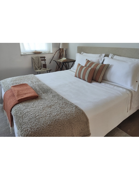 Sac de couette avec un tissu conçu avec une texture douce qui donne un effet matelassé et un dos blanc lisse, ainsi que les oreillers respectifs. Permet de dormir sur le côté lisse et de décorer avec le côté texturé.