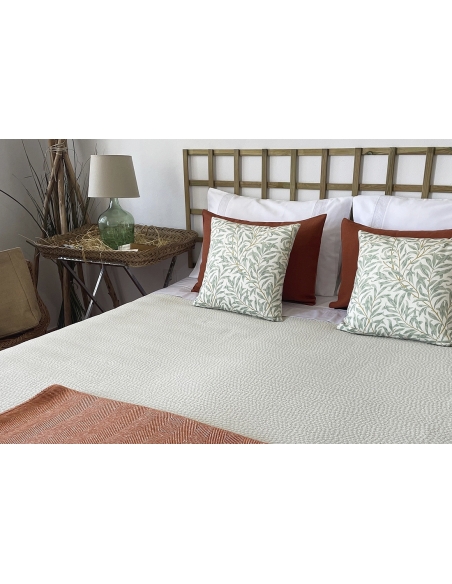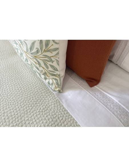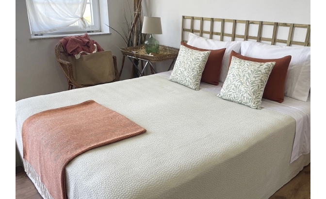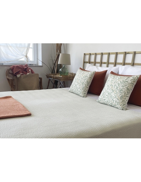 Couvre-lit en coton avec texture piquée et pois en relief. Finition avec des coins coupés et fabrication de quatre aiguilles.