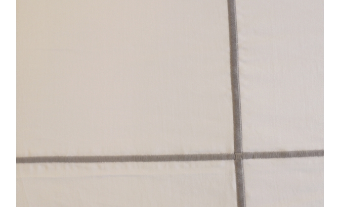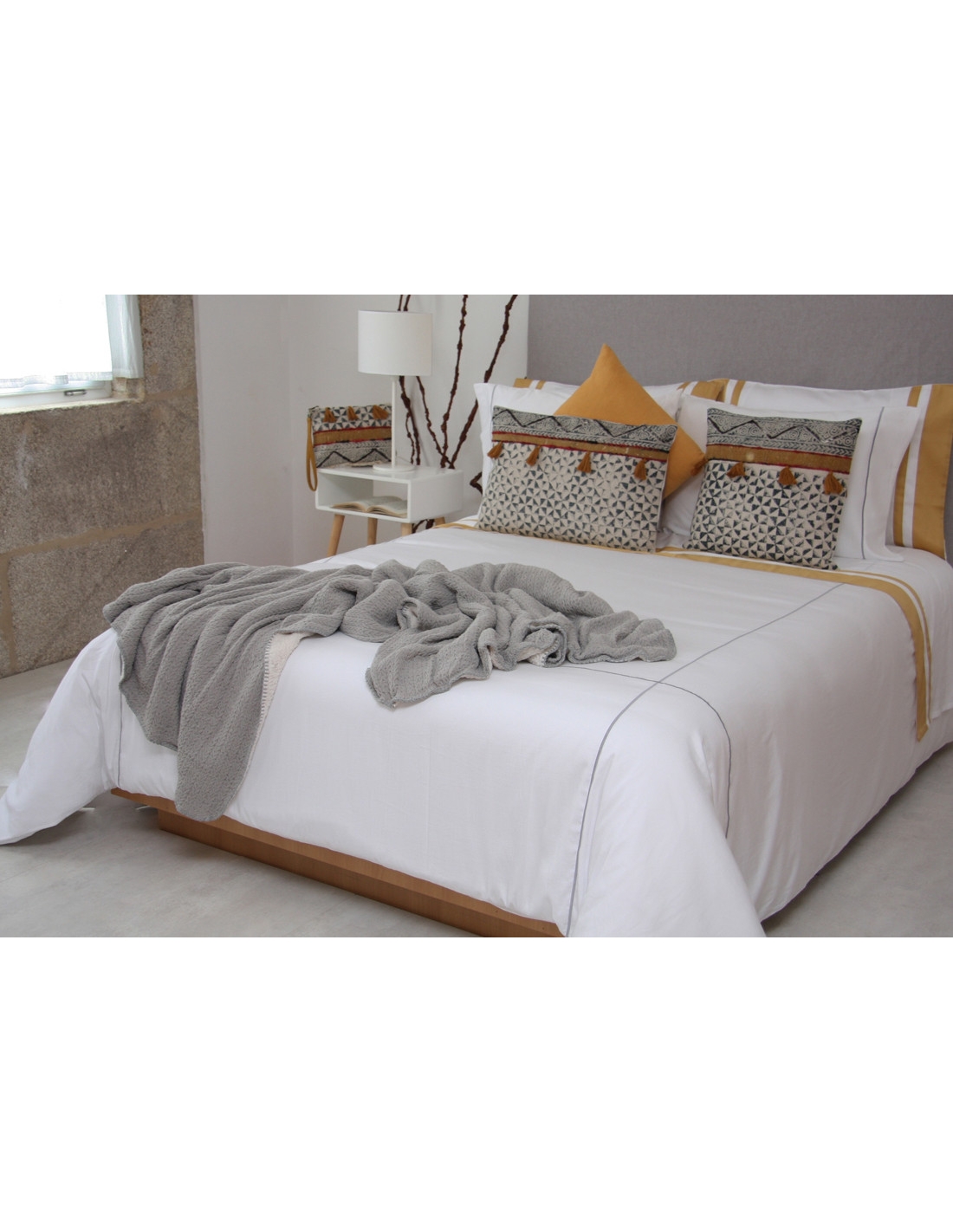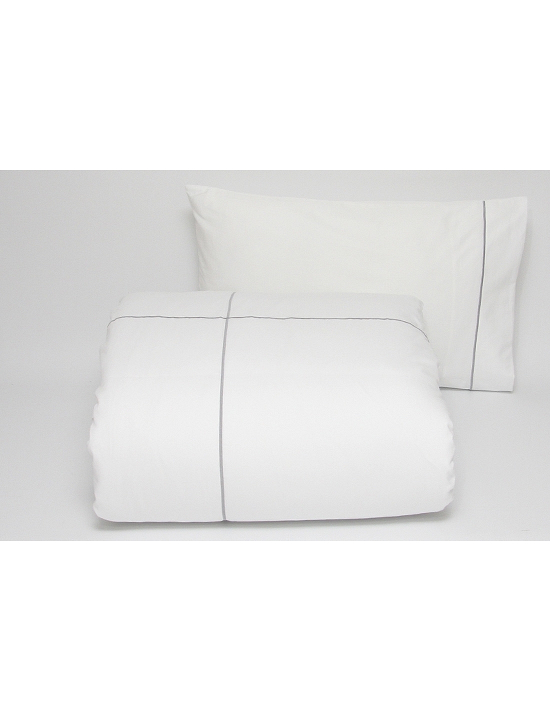 Housse de couette et oreillers unis avec broderie cordon de couleur. Les coussins ont une broderie sur un côté et se ferment avec un rabat.
