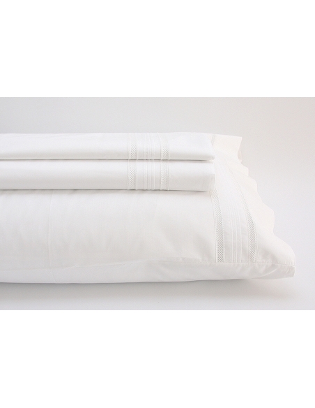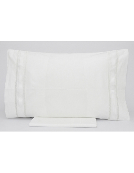 Drap de dessus et oreillers avec nervures et insertions. La feuille avec finition d'angle et les coussins sont appliqués des deux côtés et se ferment avec deux rabats.