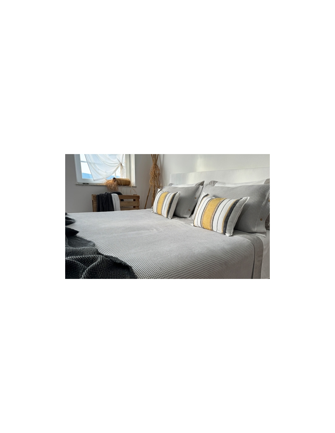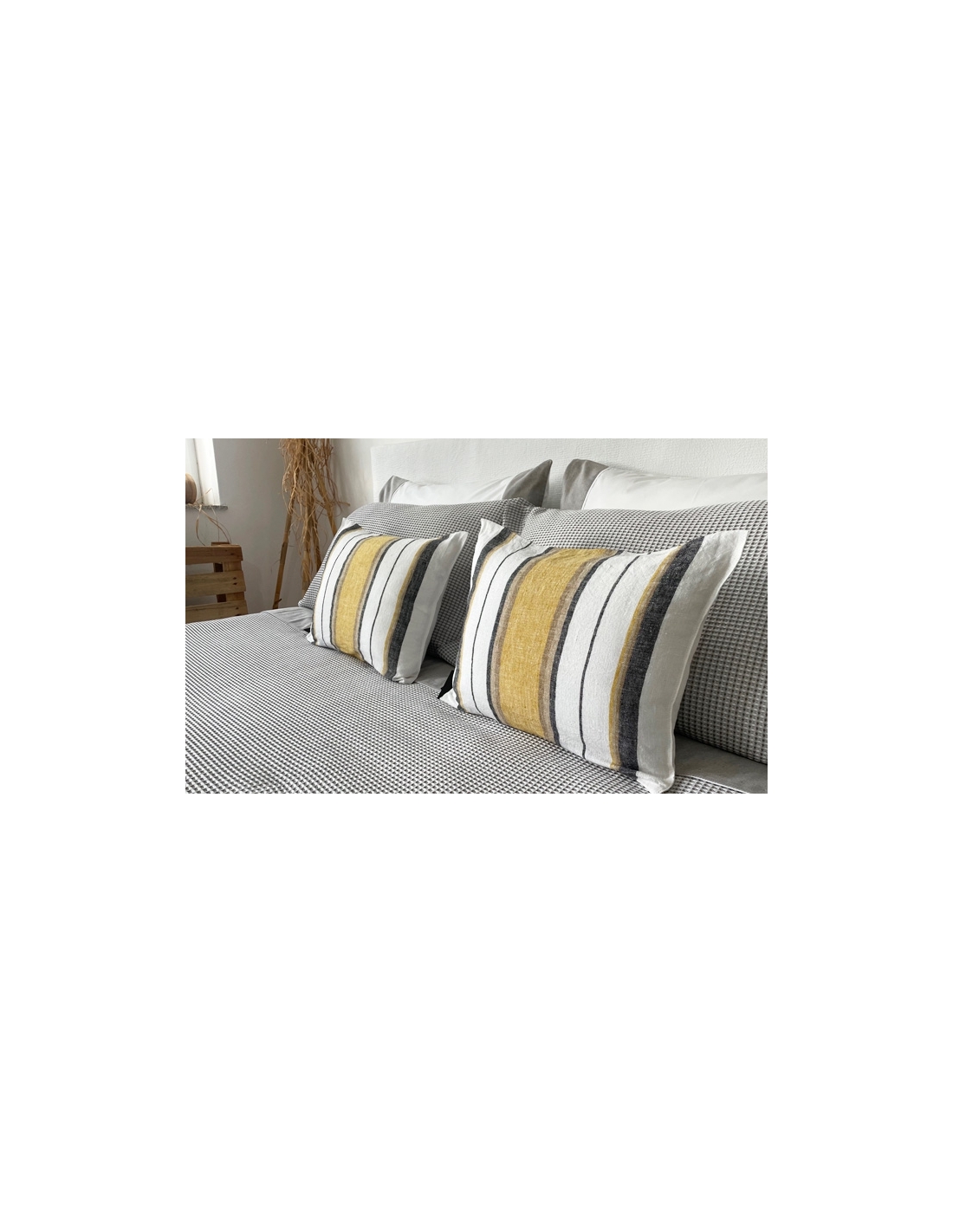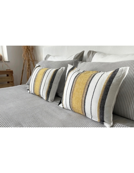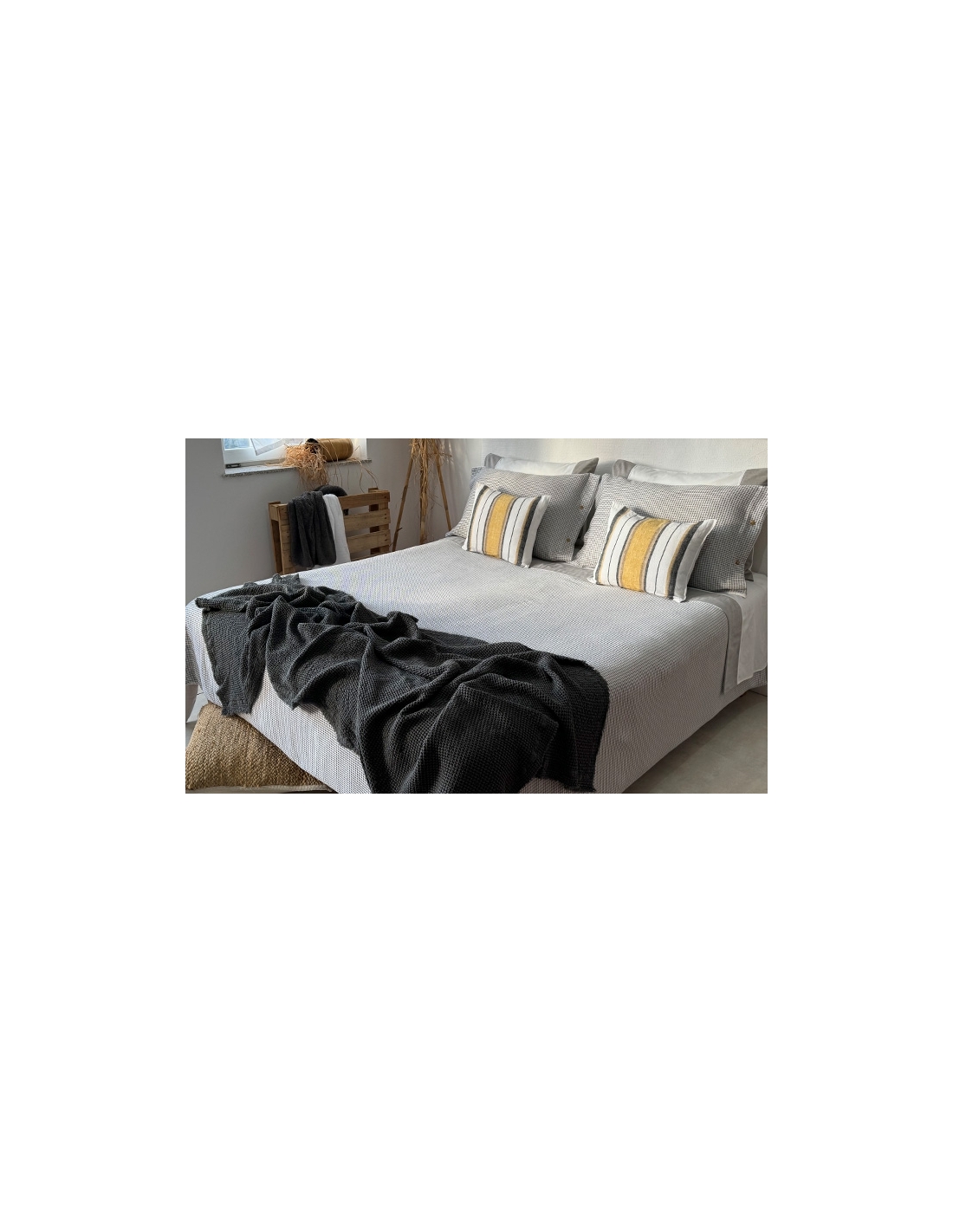 Le sac se ferme par un rabat de 0,45 cm en bas pour se placer sous le matelas ou faire une enveloppe, l'empêchant de glisser. Et les coussins se ferment avec des boutons des deux côtés.