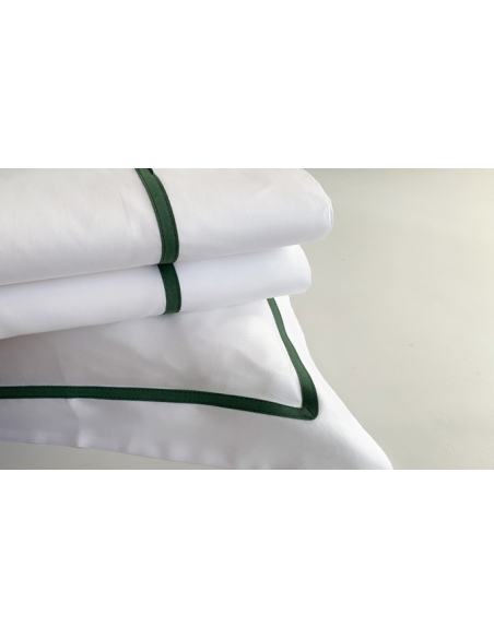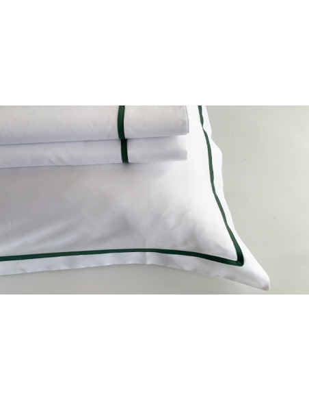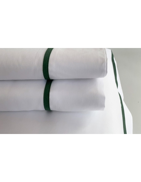 Drap de dessus et oreillers avec applications de barres de couleur dans le même tissu. Les coussins sont appliqués sur trois côtés et se ferment avec un rabat.