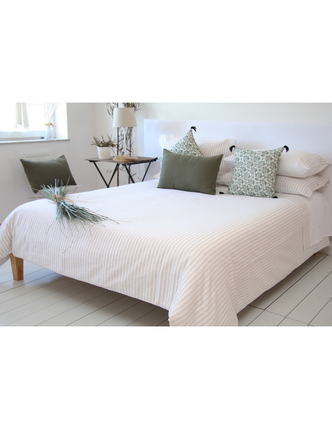 Housse de couette avec motif à rayures et dos uni blanc, ainsi que les oreillers respectifs. Vous permet de dormir sur le côté lisse et de décorer avec le côté imprimé.