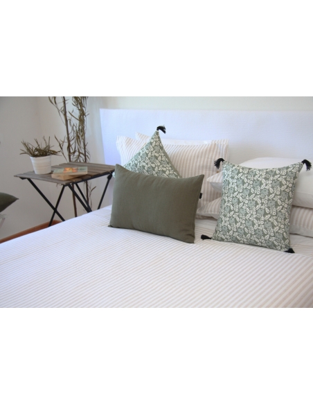Housse de couette 100% coton avec motif et revers en percale 200 fils, ainsi que des oreillers de différentes tailles.