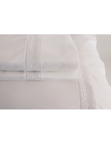 Drap de dessus et oreillers avec insertion. Les coussins sont appliqués des deux côtés et se ferment par deux rabats.