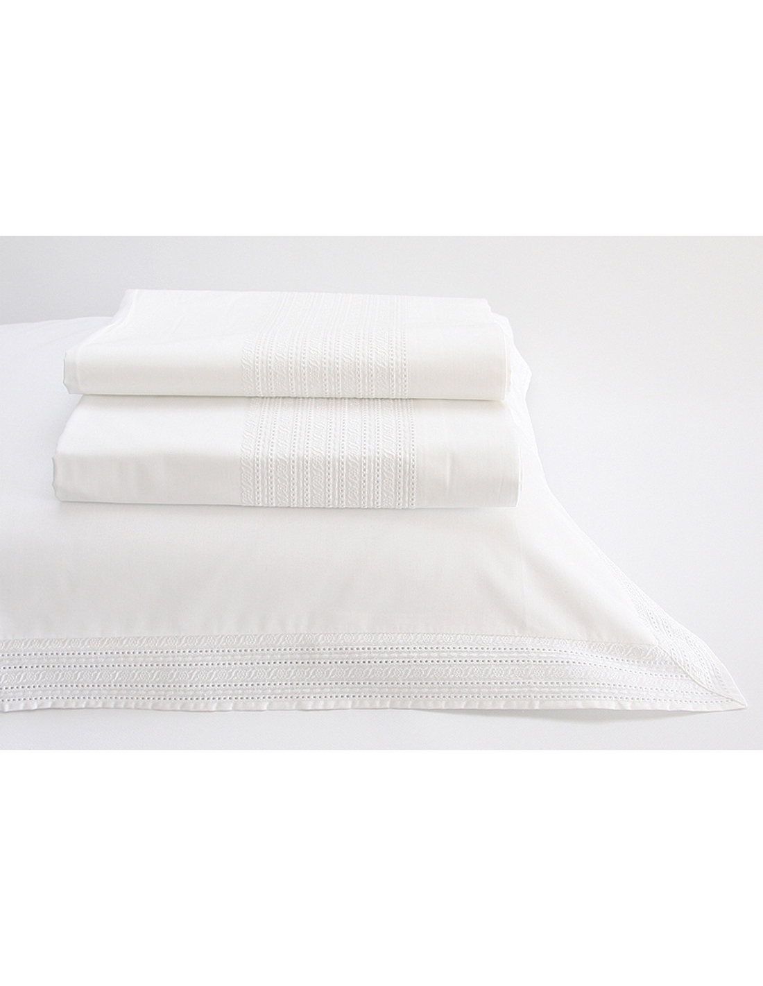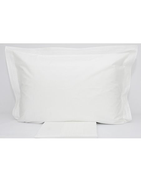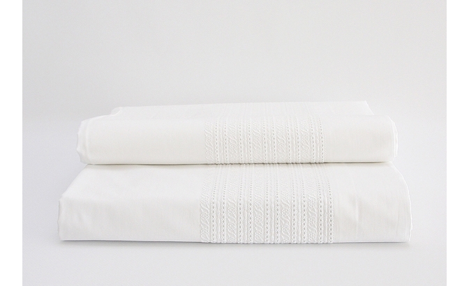 Drap supérieur et oreillers brodés. Les coussins sont brodés sur les trois côtés et se ferment par un rabat.