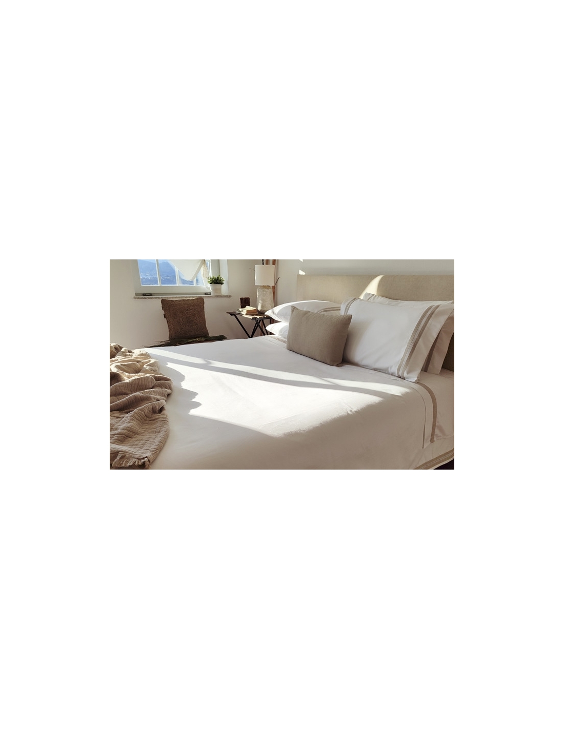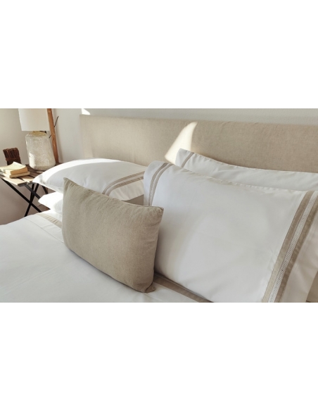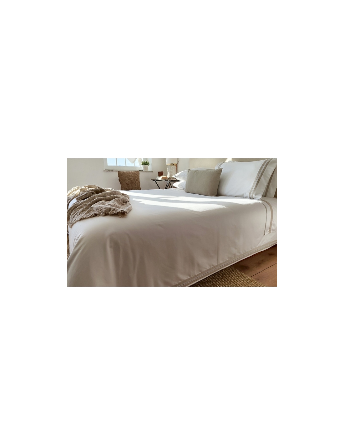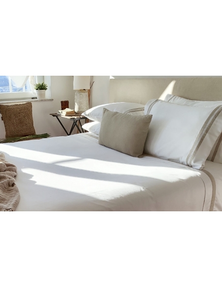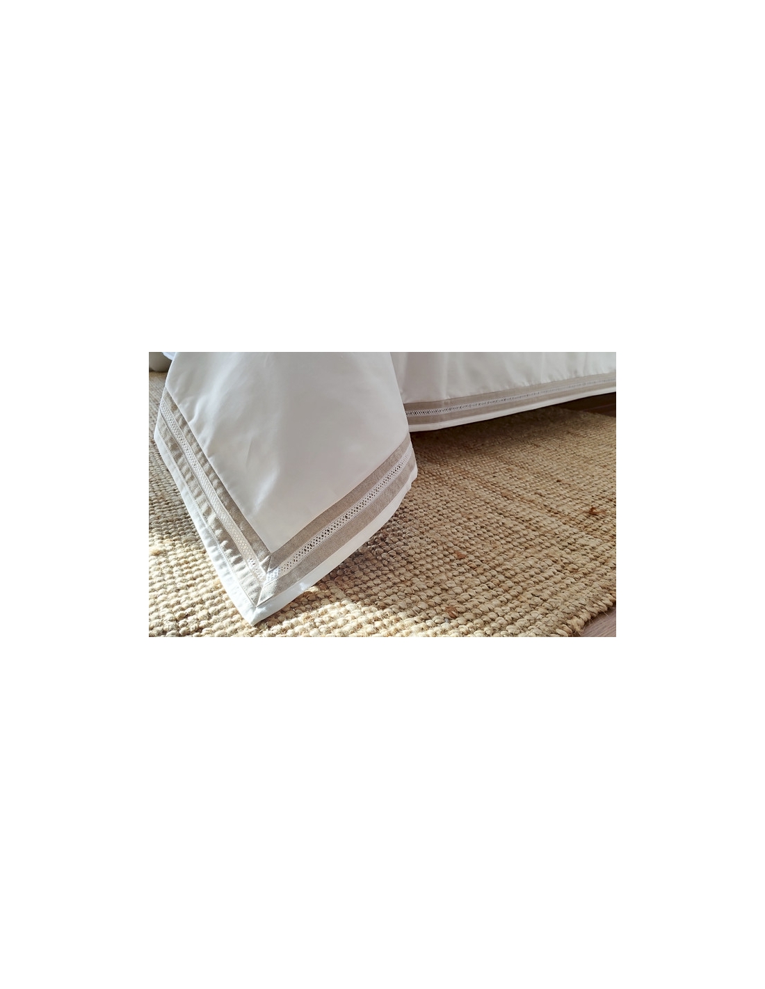 Housse de couette en coton satiné 500 fils avec application de broderie tout autour. Les coussins sont lisses avec broderie des deux côtés et se ferment par un rabat.