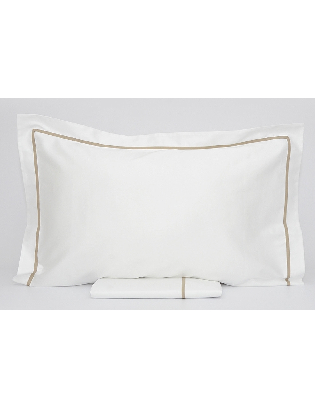Drap de dessus et oreillers avec applications de barres de couleur dans le même tissu. Les coussins sont appliqués sur trois côtés et se ferment avec un rabat.