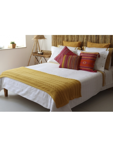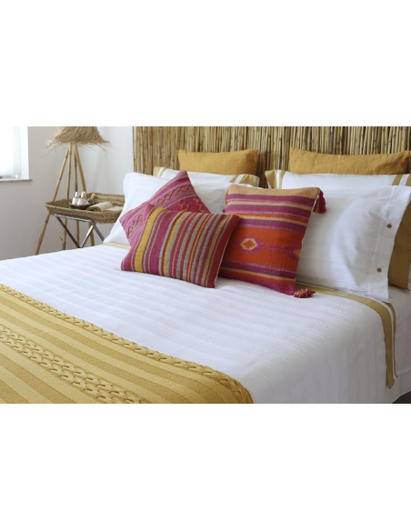 Le sac se ferme par un rabat de 0,45 cm en bas pour se placer sous le matelas ou faire une enveloppe, l'empêchant de glisser. Et les coussins se ferment avec des boutons des deux côtés.