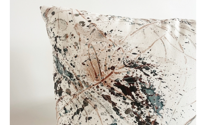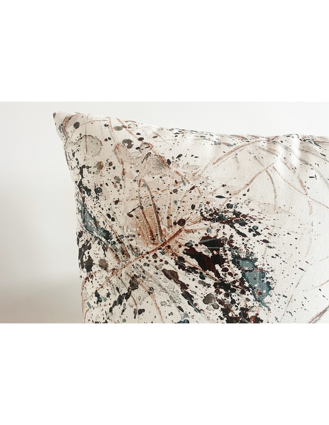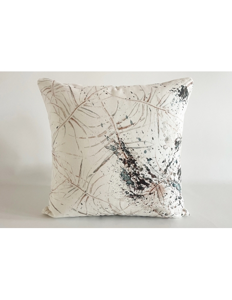 Housse de coussin en coton avec impression numérique sur le devant et dos uni, identique à la couleur de fond. Il a un zip invisible sur un côté.