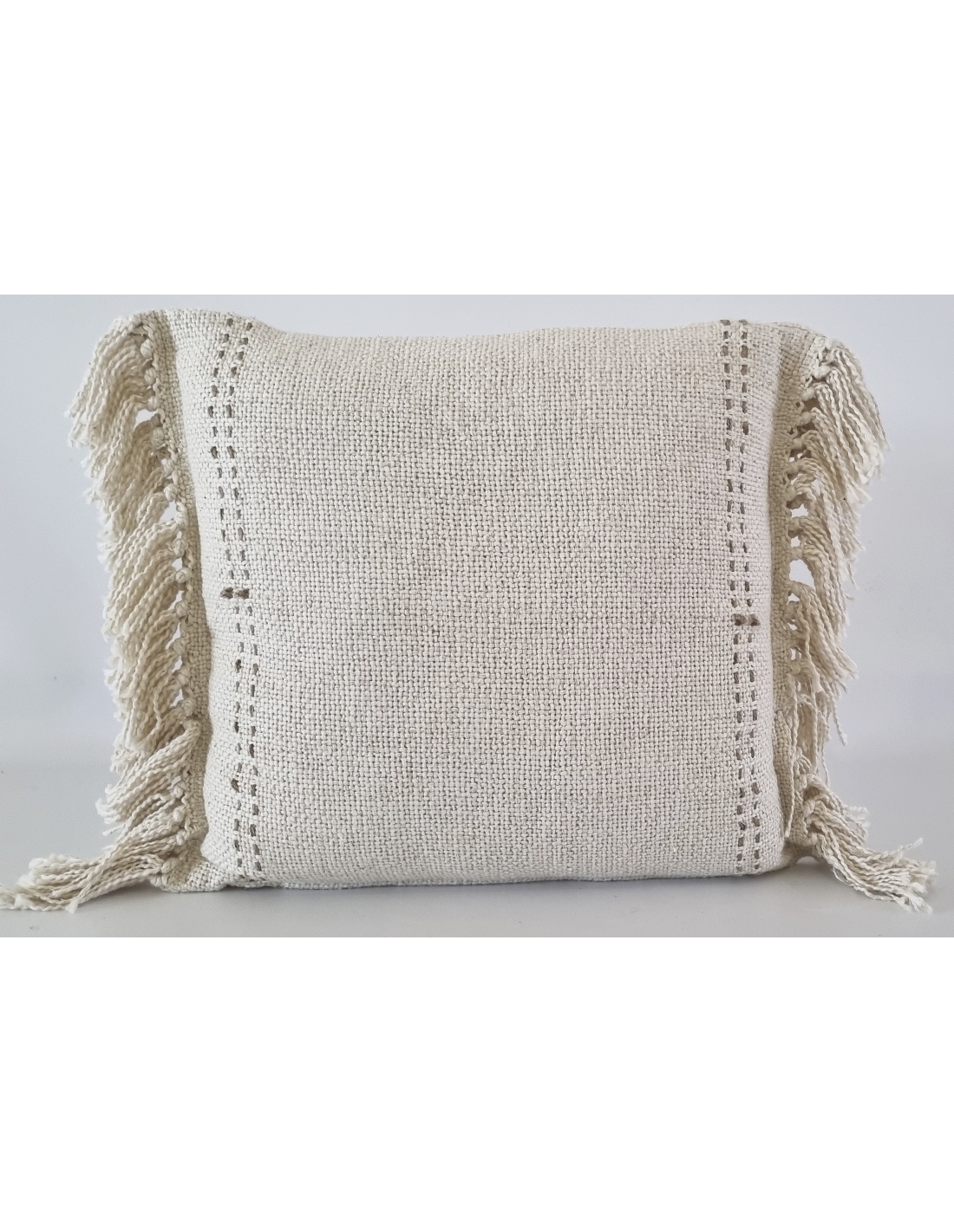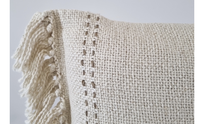 Housse de coussin en tissu doux, travaillée selon une technique irrégulière qui associe la fibre de jute au coton. Cette fusion de matériaux naturels donne une touche unique et spéciale, ce qui en fait le complément parfait à tout décor.
