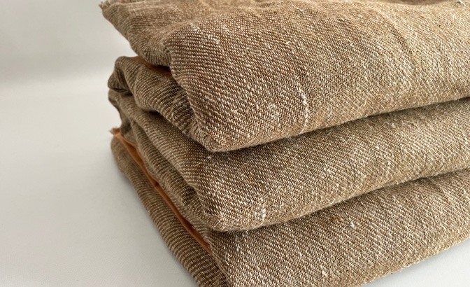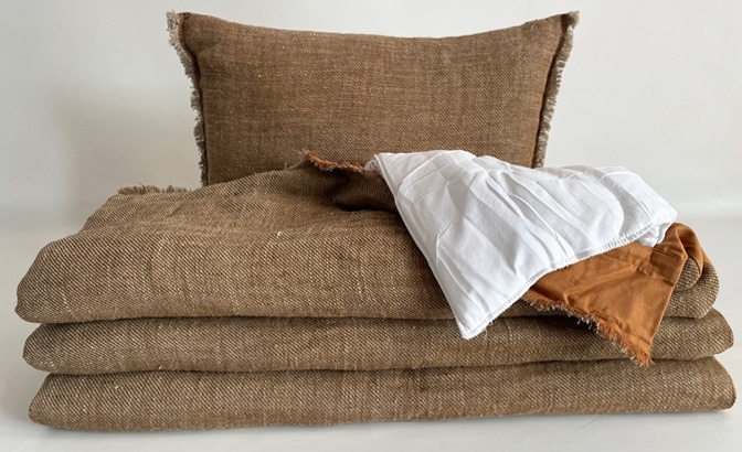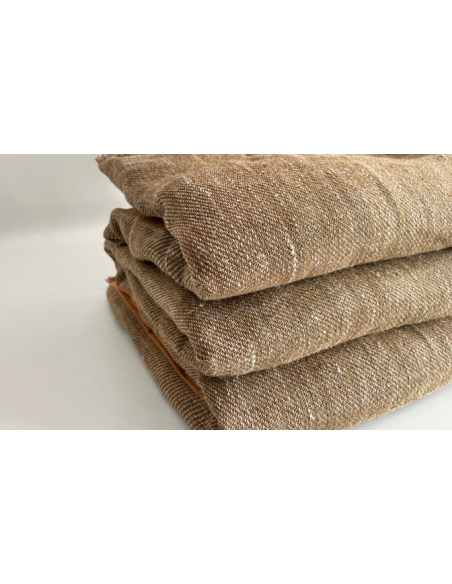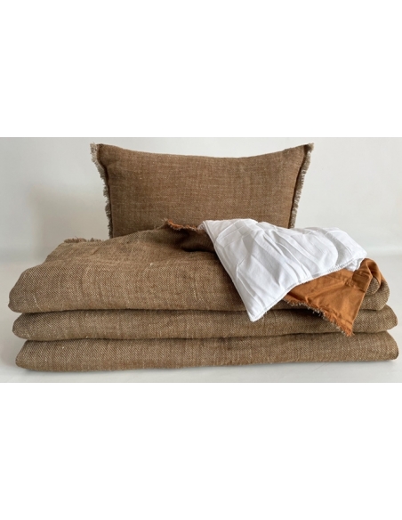 Plaid à deux faces, une face en lin et l'autre en coton. Il a des franges aux deux extrémités et une fermeture éclair sur l'envers pour insérer ou retirer le rembourrage.