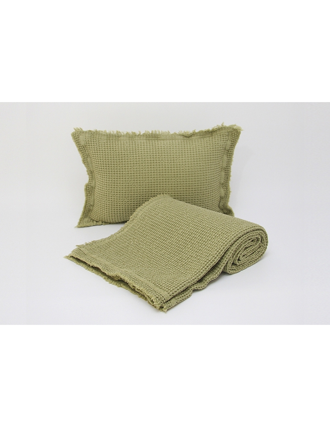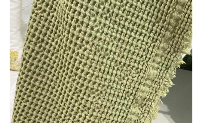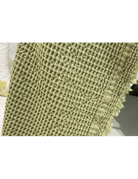 Couverture avec point "nid d'abeille", lavé et pré-rétréci, ce qui la rend très agréable au toucher et pratique, car elle ne rétrécit pas au lavage.