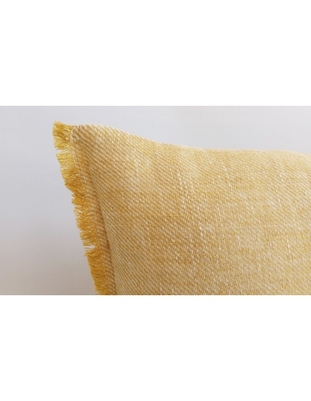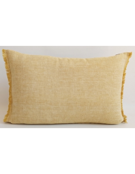 Housse de coussin avec franges aux extrémités. Il est réversible et possède une fermeture éclair sur un côté.
