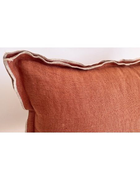 Housse de coussin en lin uni, avec coutures intérieures soulignant sa forme, et double rabat bordé d'un biais contrastant.
