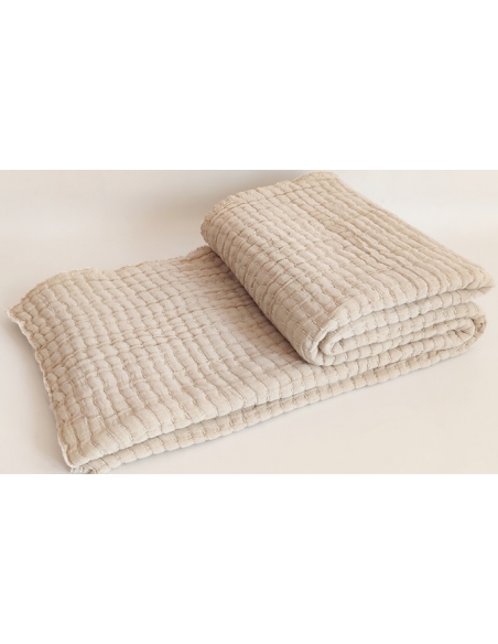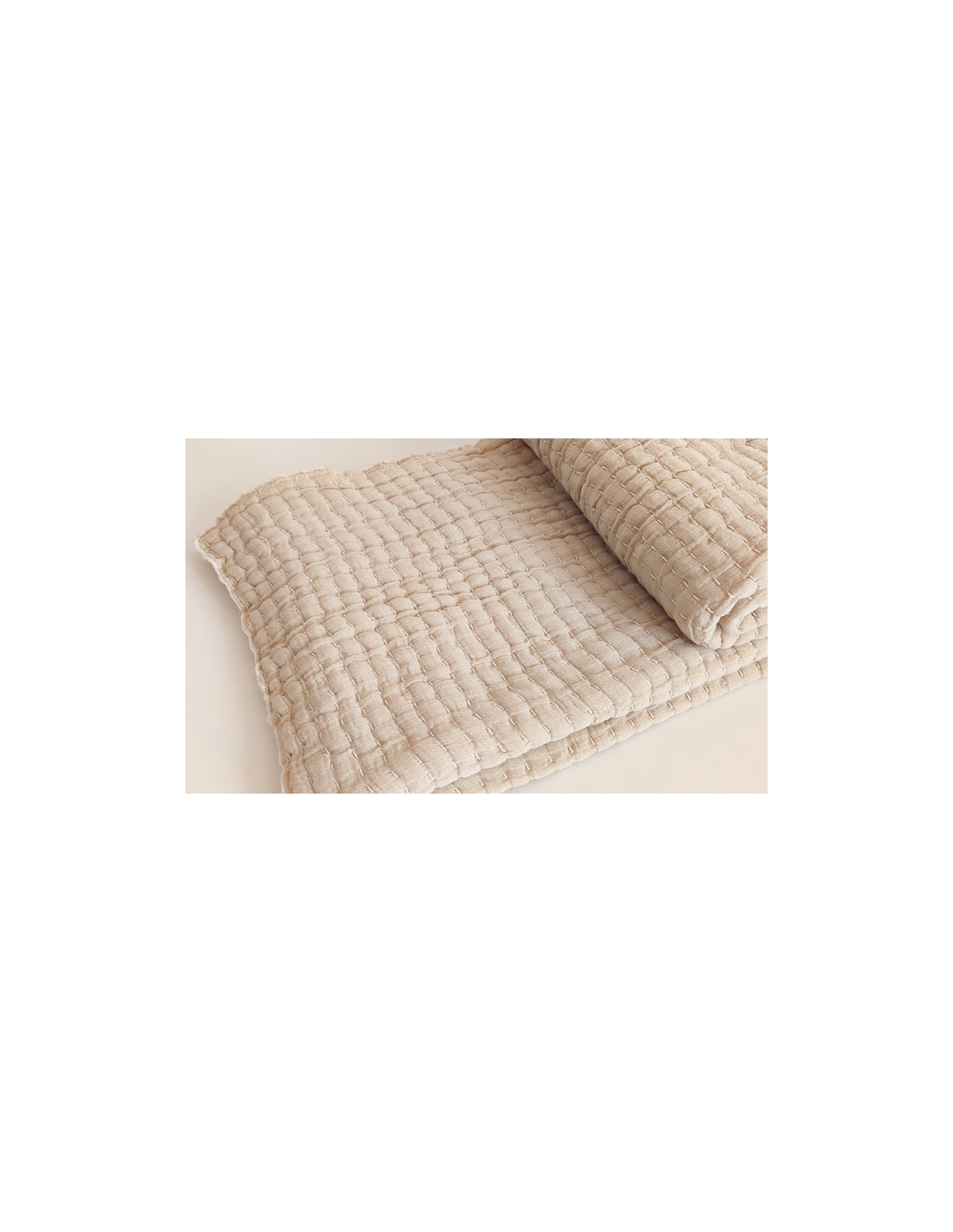 Couverture en coton aux bords effilochés et aux points Kantha, lui conférant un aspect matelassé doux et rustique.