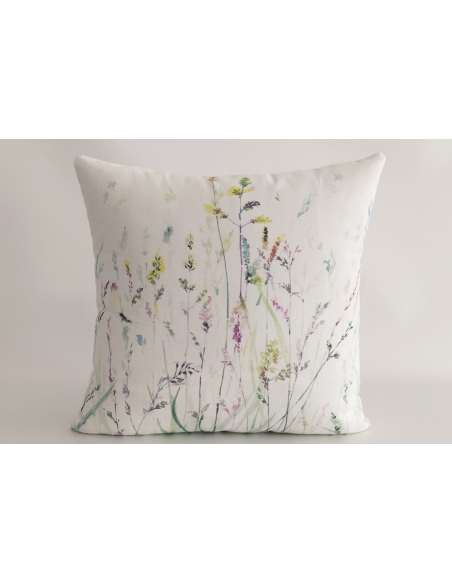 Housse de coussin en coton avec impression numérique sur le devant et dos uni, identique à la couleur de fond. Il a un zip invisible sur un côté.