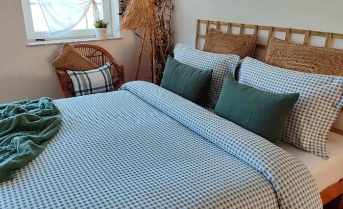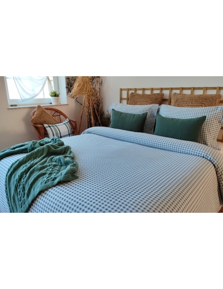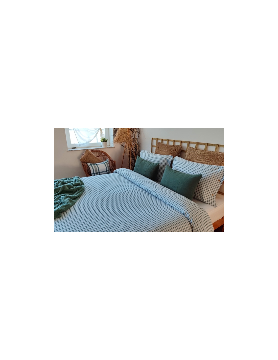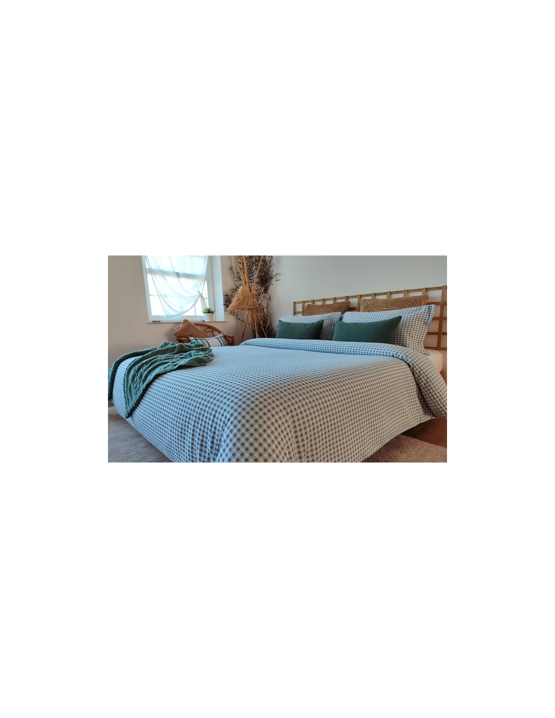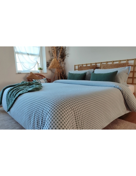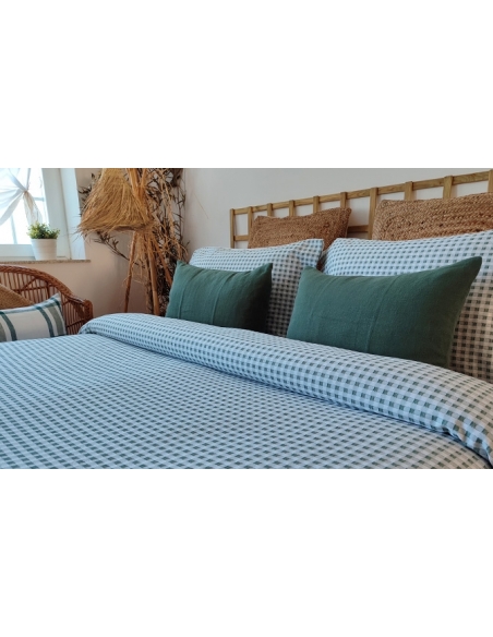 Housse de couette 100% coton avec motif et revers en percale 200 fils, ainsi que des oreillers de différentes tailles.