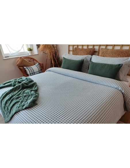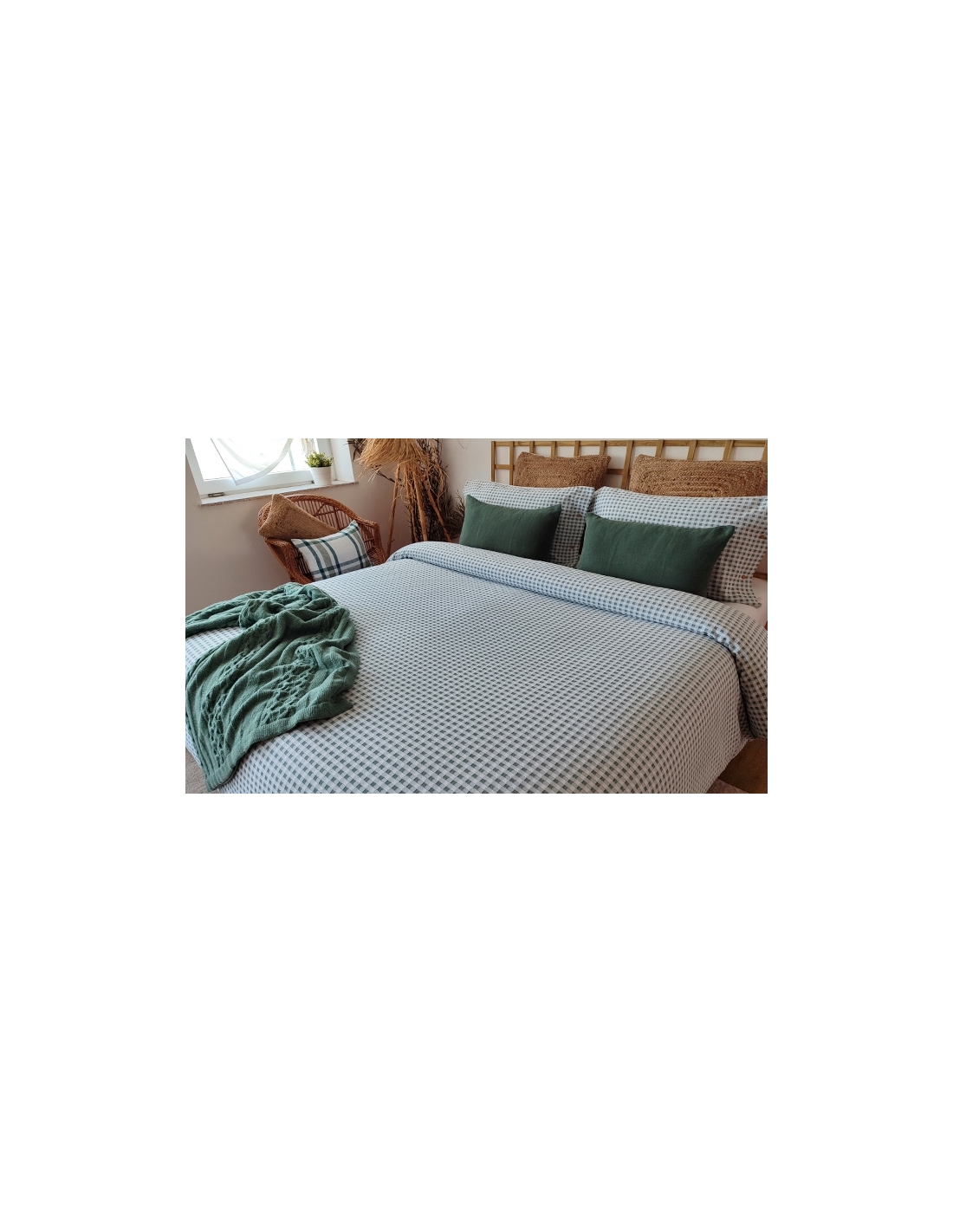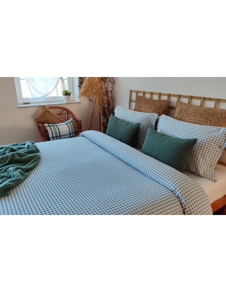 Le sac se ferme par un rabat de 0,45 cm en bas pour se placer sous le matelas ou faire une enveloppe, l'empêchant de glisser. Les coussins se ferment avec des boutons des deux côtés.