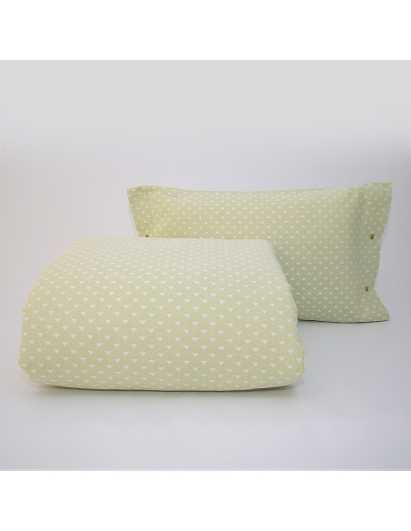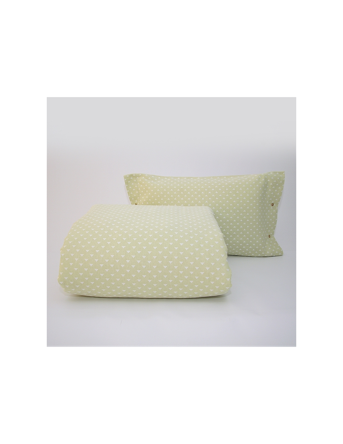 Le sac se ferme par un rabat de 0,45 cm en bas pour se placer sous le matelas ou faire une enveloppe, l'empêchant de glisser. Les coussins se ferment avec des boutons des deux côtés.