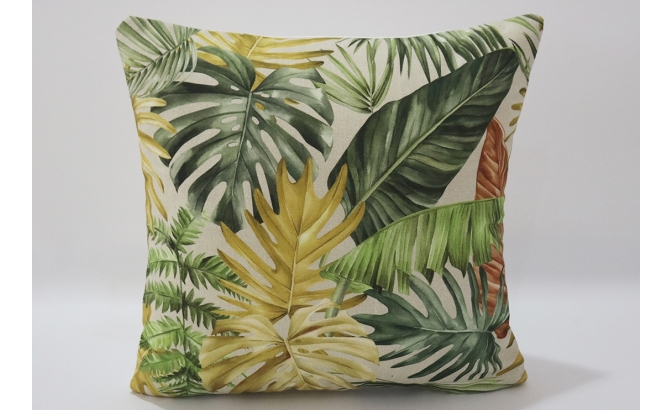 Housse de coussin en coton avec impression numérique sur le devant et dos uni, identique à la couleur de fond. Il a un zip invisible sur un côté.