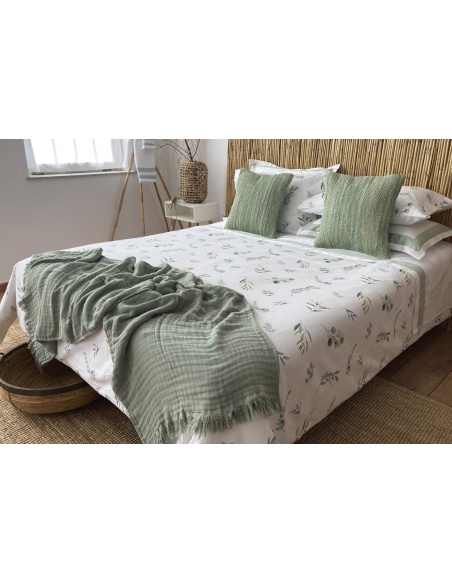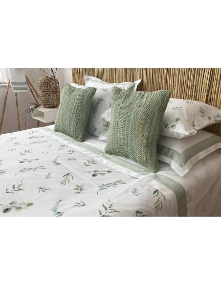 Housse de couette 100% coton avec motif et revers en percale 200 fils, ainsi que des oreillers de différentes tailles.